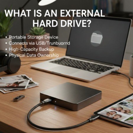 An external hard drive is a physical device. You plug it into your computer or laptop using a cable. It stores your data just like a USB, but with much more space.