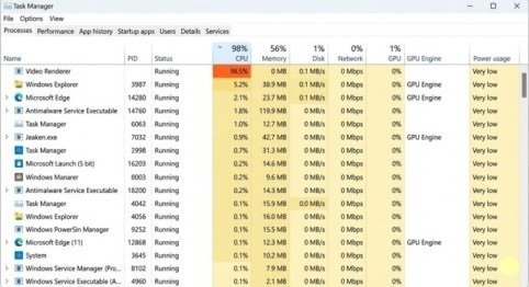 - Task Manager shows CPU constantly at 90-100% during normal tasks
