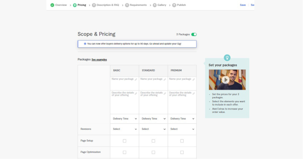 Fiverr offers three packages: Basic, Standard, and Premium. You can create all three or select one. Give each package a title and description. Be creative, mention delivery time, and make your pricing attractive.