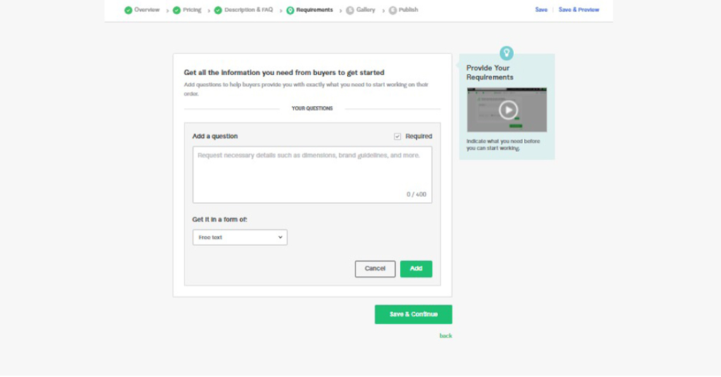 Mention all the details you need from buyers to start work. For example, if you are designing a logo, ask for the business name, industry, and color preferences.