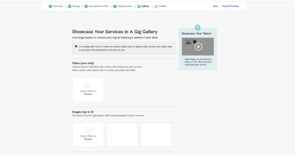 Upload images, videos, or PDFs showcasing your work. High-quality visuals make your gig more appealing and increase client trust.