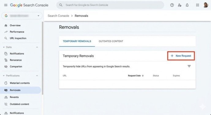 Navigate to Google Search Console and select the property containing the URL you want removed. Click “Removals” in the left sidebar navigation menu. Click the red “NEW REQUEST” button in the Temporary Removals tab.