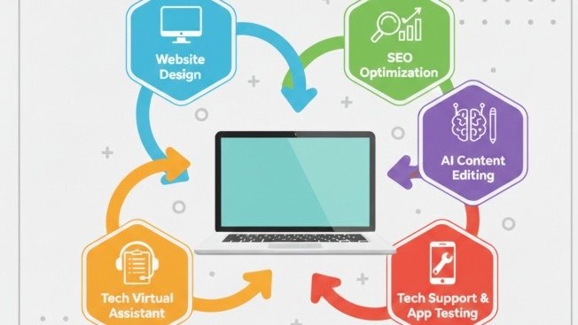 Begin with website design, SEO, AI content editing, tech support, or virtual assistant tasks that are in high demand.