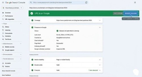 After inspecting a URL, click the “Request Indexing” button. Google adds your URL to a priority crawling queue. While indexing isn’t guaranteed or instant, most requested URLs get crawled within hours rather than days or weeks. This feature proves especially valuable for time-sensitive content like news articles, limited-time offers, or competitive response content.