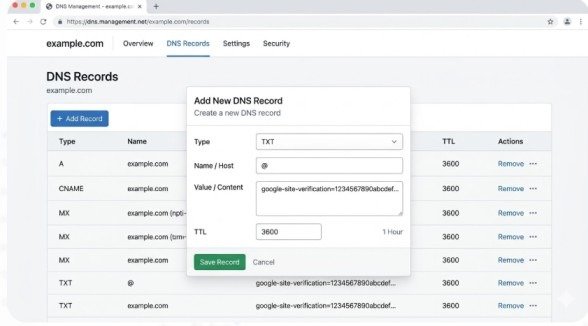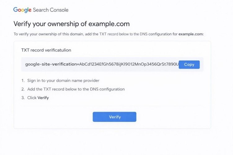 DNS (Domain Name System) TXT records store text information about your domain. When you verify domain using DNS in Google Search Console, you add a special TXT record containing a unique verification code that proves you control the domain’s DNS settings.
