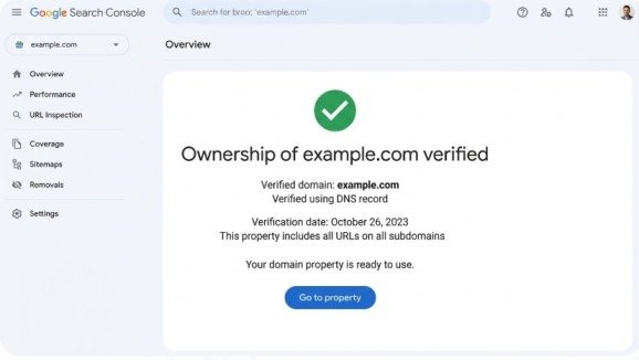 If verification succeeds: You’ll see a green success message confirming domain ownership. You gain immediate access to your new domain property and can start using all Search Console features.